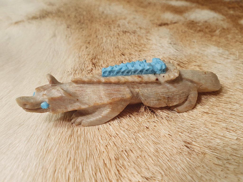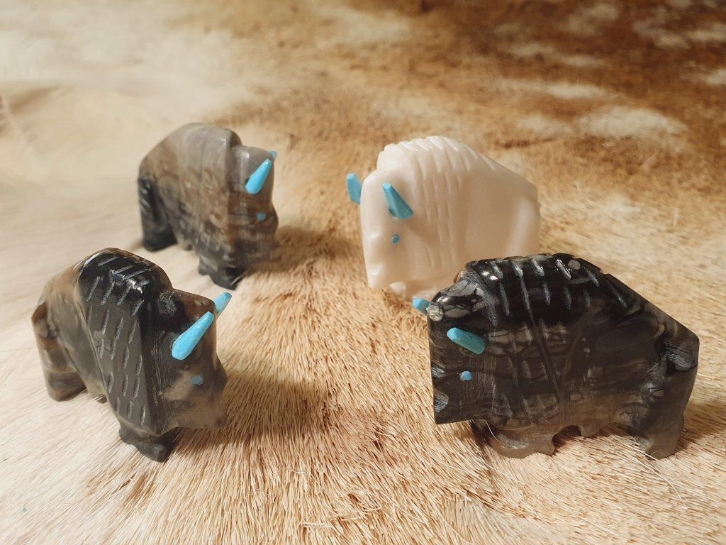 Des pierres de contraste ou d'autres matériaux sont souvent choisis pour des détails caractéristiques tels que les yeux, les cornes, les lignes du coeur (qui représentent l'essence spirituelle) ou pour les éléments qui peuvent être mis sur le dos de l'animal comme offrande à l'esprit. Certaines pierres ont été associées à des énergies spécifiques ou des éléments de la terre. Par exemple, la turquoise peut représenter le ciel ou l'eau, la lignite peut être utilisée pour signifier l'éternité.