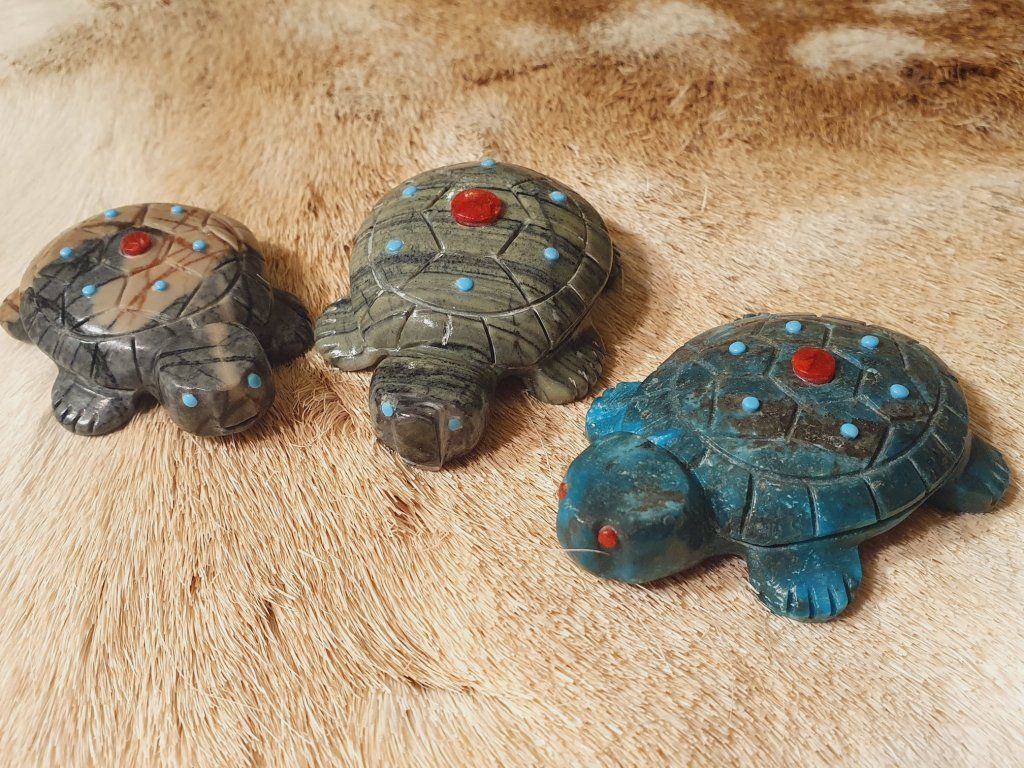 Longueur 30 petites tortues: 2.8 à 3.2cm, assortiment de pierres semi-précieuses, perles de verre couleur turquoise, lanière de peau de cerf.