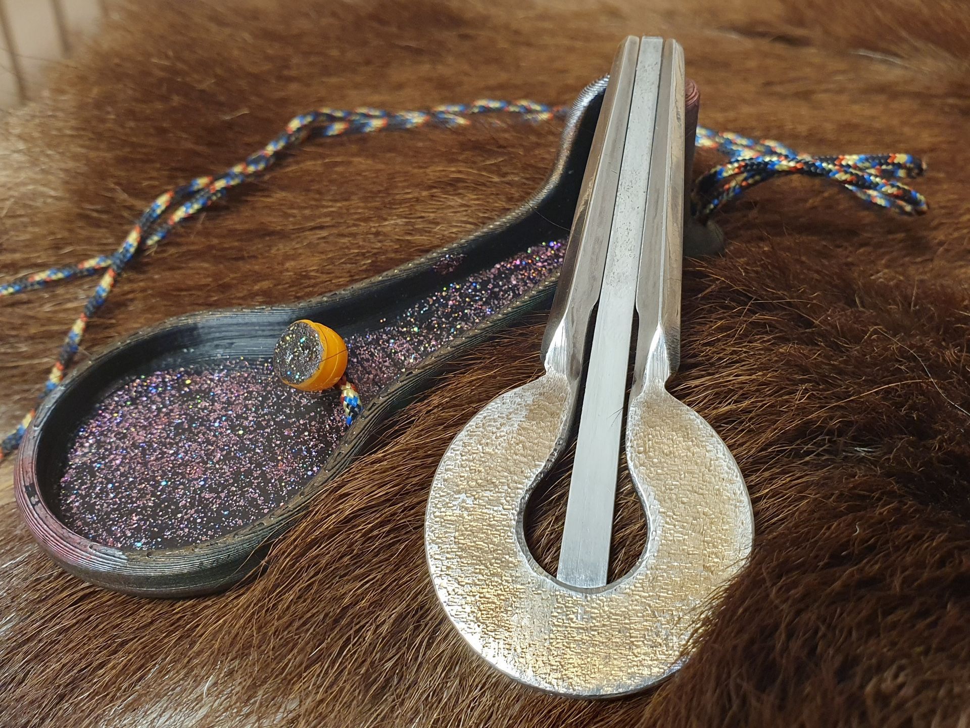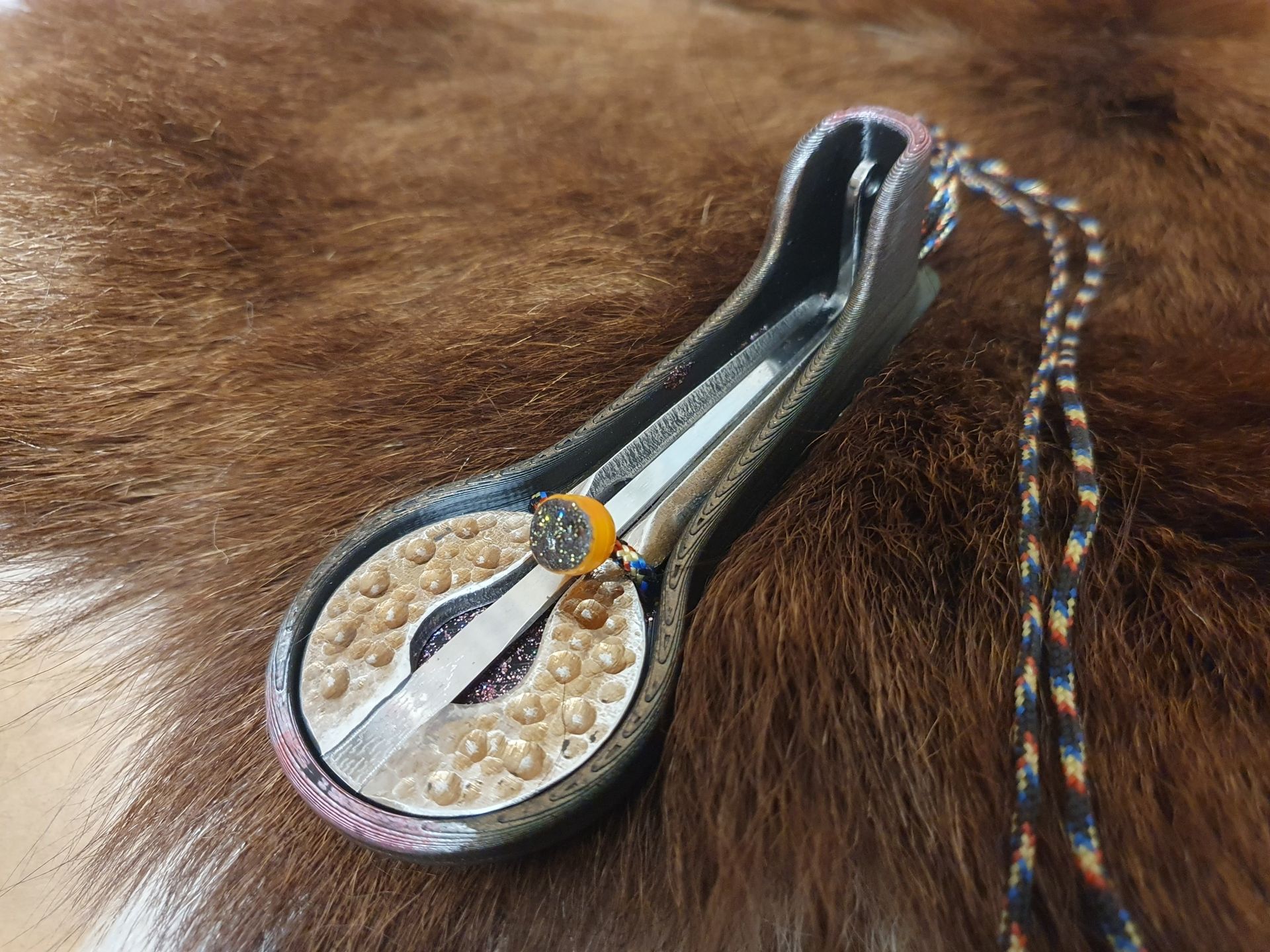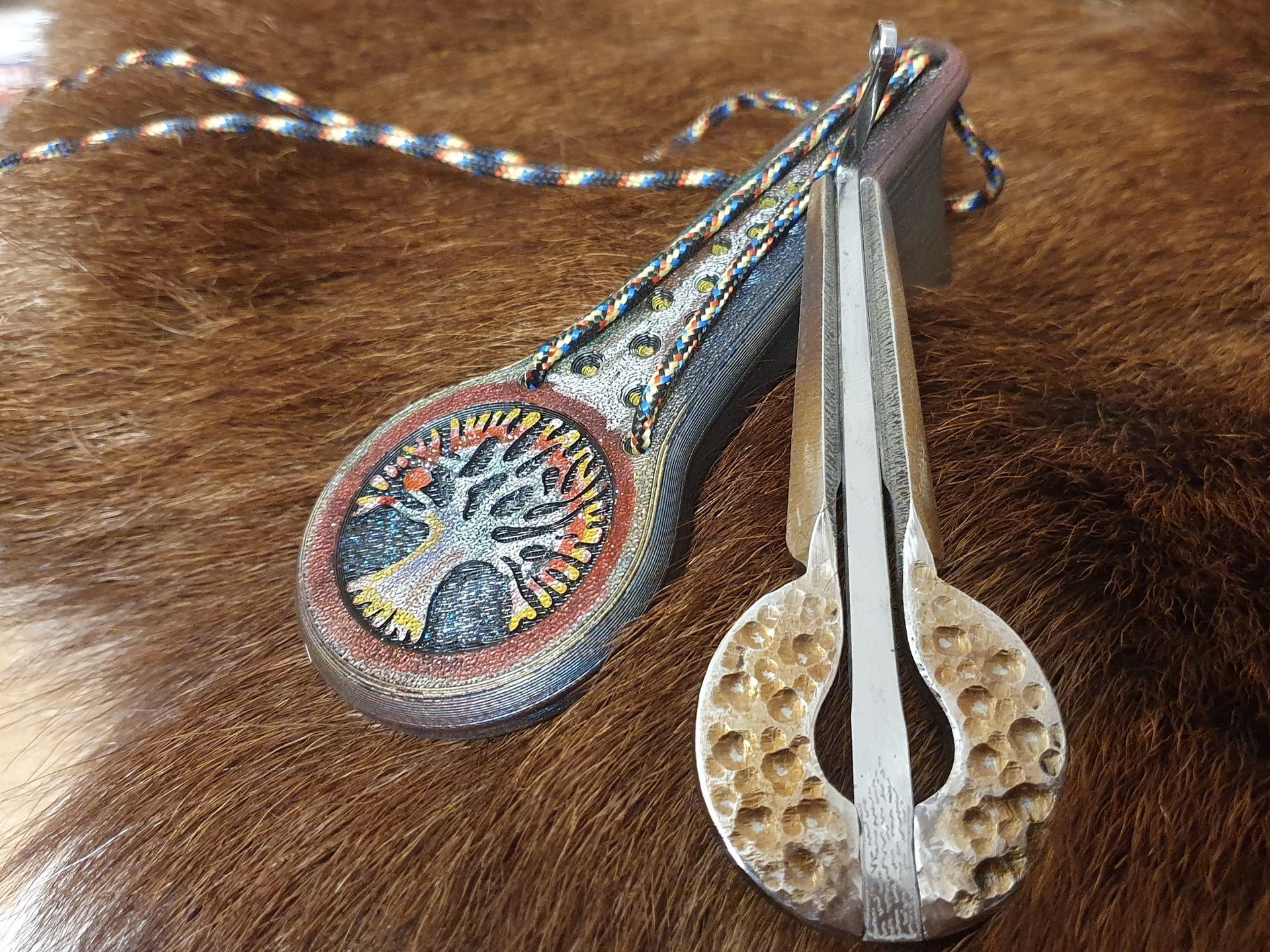 La Khomus repose sur son boîtier en bois de loupe de bouleau, finement travaillé par le forgeron également. Tonalité, sur demande.