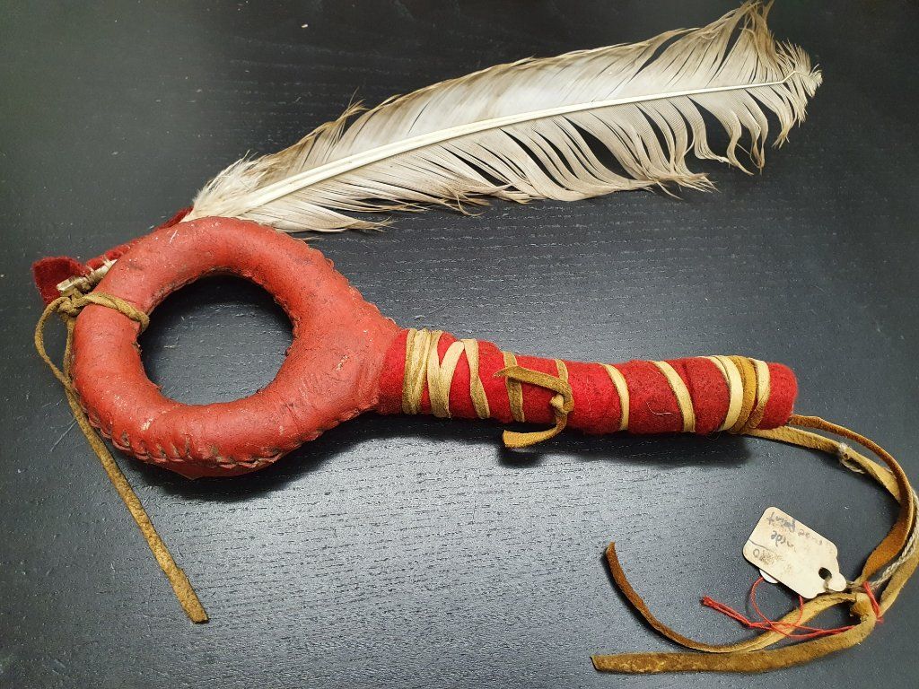Les Amérindiens utilisaient des teintures extraites de racines et de baies pour décorer leurs hochets en peaux.